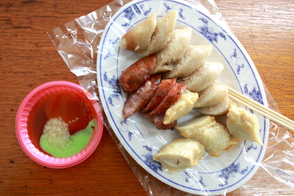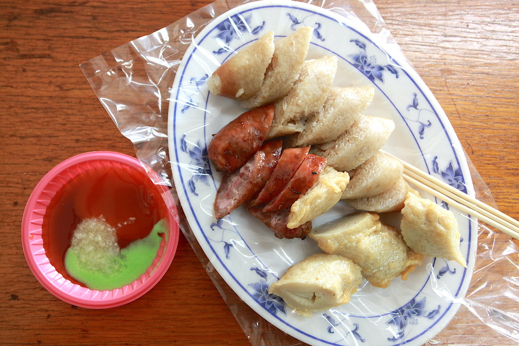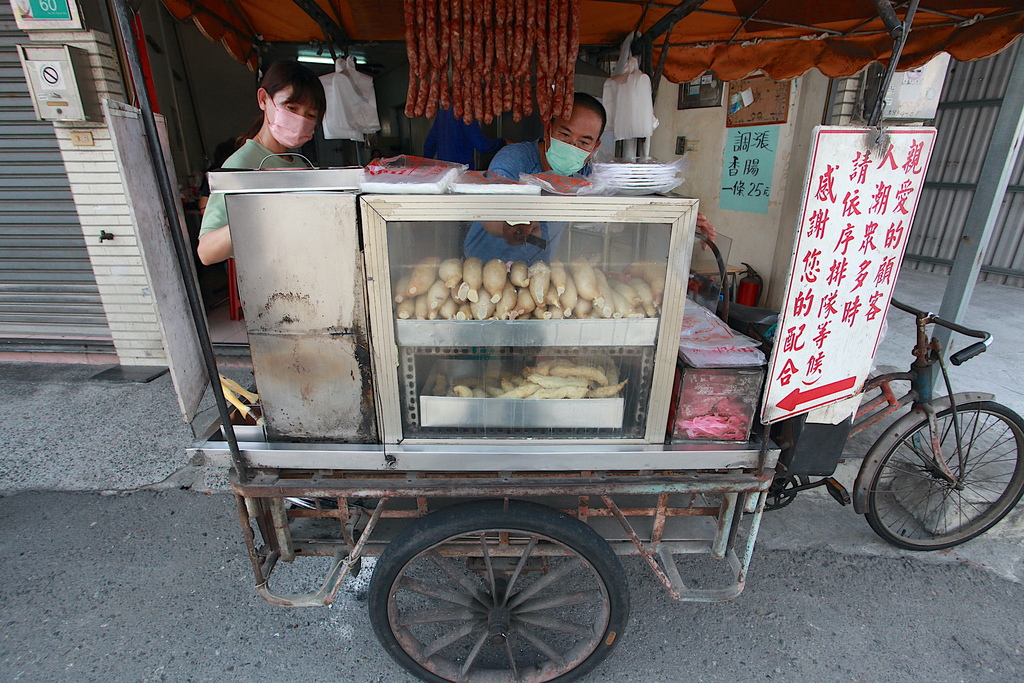把這台三輪車放置在店面外頭超吸睛,餐車櫃子裡堆滿大腸和黑輪等食材。