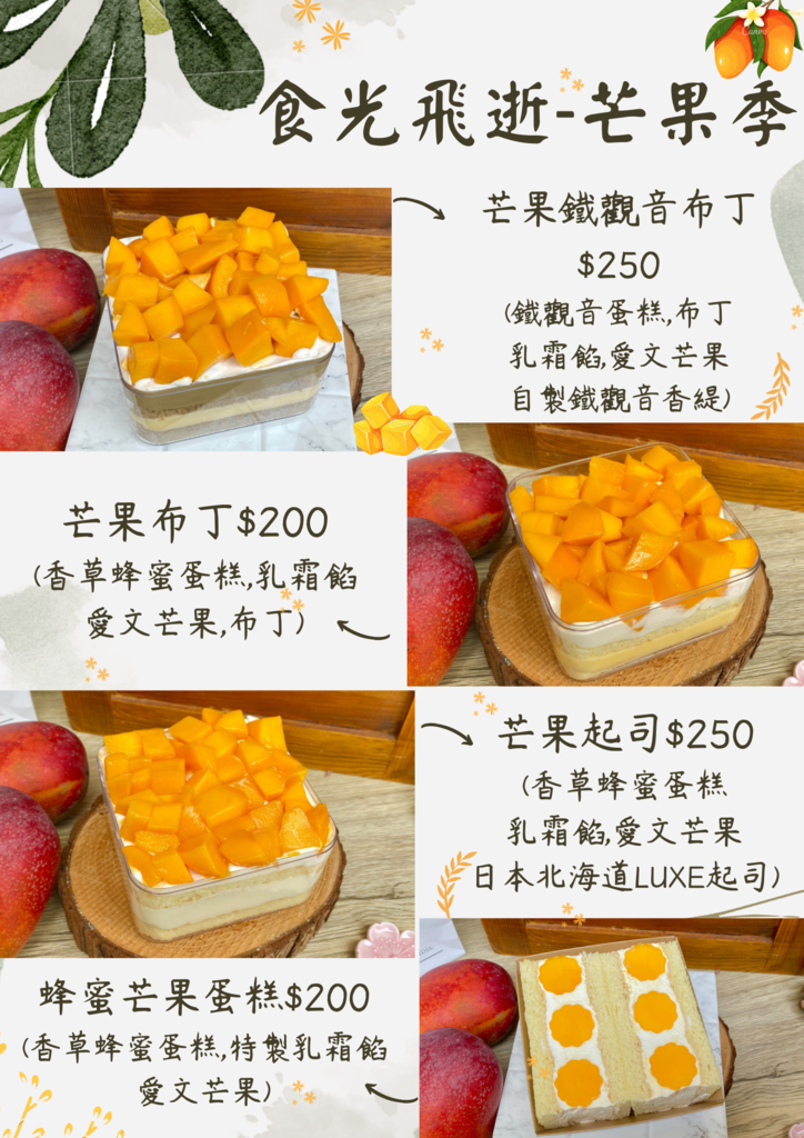 這張菜單是從食光飛逝官方下載,菜單有芒果布丁200元、芒果起司250元、芒果鐵觀音布丁250元及蜂蜜芒果蛋糕200元等 ,芒果布丁是採用香草蜂蜜蛋糕、布丁、乳霜餡、愛文芒果來製作,芒果起司是採用香草蜂蜜蛋糕、乳霜餡、愛文芒果、日本北海道LUXE起司來製作,芒果鐵觀音布丁是採用鐵觀音蛋糕、乳霜餡、愛文芒果、自製鐵觀音香緹、布丁來製作,蜂蜜芒果蛋糕是採用香草蜂蜜蛋糕、愛文芒果、特製乳霜餡來製作,除了菜單上小高有買到芒果寶寶 270元、 芒果布丁可可250元、 芒果優格布丁230元及芒果原味奶酪250元等。