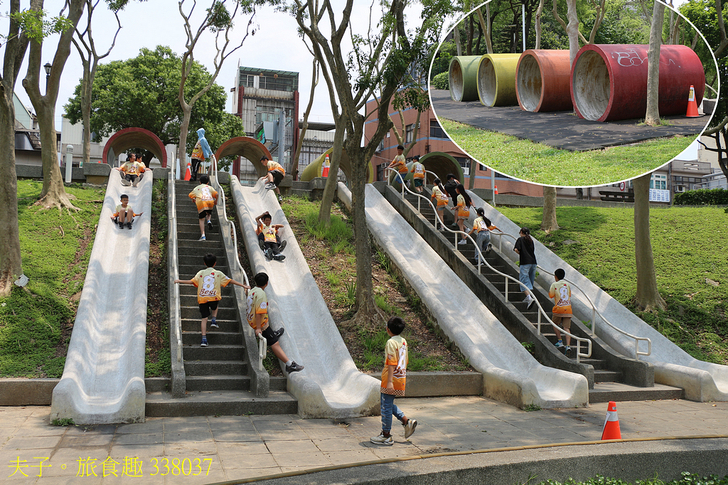 戶外的時空隧道溜滑梯充滿孩子的歡笑聲,溜滑梯高處入口的四支彩色大水管,分別代表老街溪流經的地域,龍潭、平鎮、中壢與大園 (出海口)。