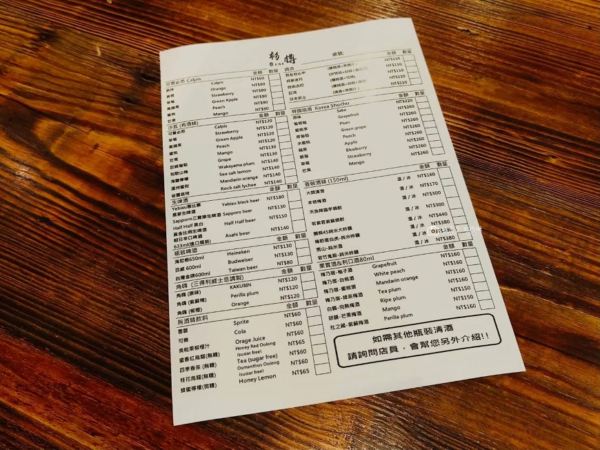 整體來說,杉樽串燒 是一間氛圍溫暖的日式居酒屋,在台南的居酒屋裡相當有特色。地理位置更是得天獨厚,鄰近海安路、神農街等熱門景點,用餐後還能延伸到台南夜生活的小旅行。雖然店面不大,但不論是充滿日式元素的裝潢氛圍,還是各式美味串燒,都讓人忍不住放慢腳步,在這裡好好享受屬於夜晚的悠閒時光,以下就是我們點的餐點提供參考囉~