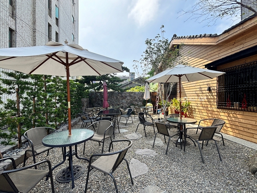 餐廳外圍有小小的庭園區,碎石步道搭配木造建築,隱身市區卻多了點愜意感。如果魚池就在這裡,肯定會成為親子族群的最愛。