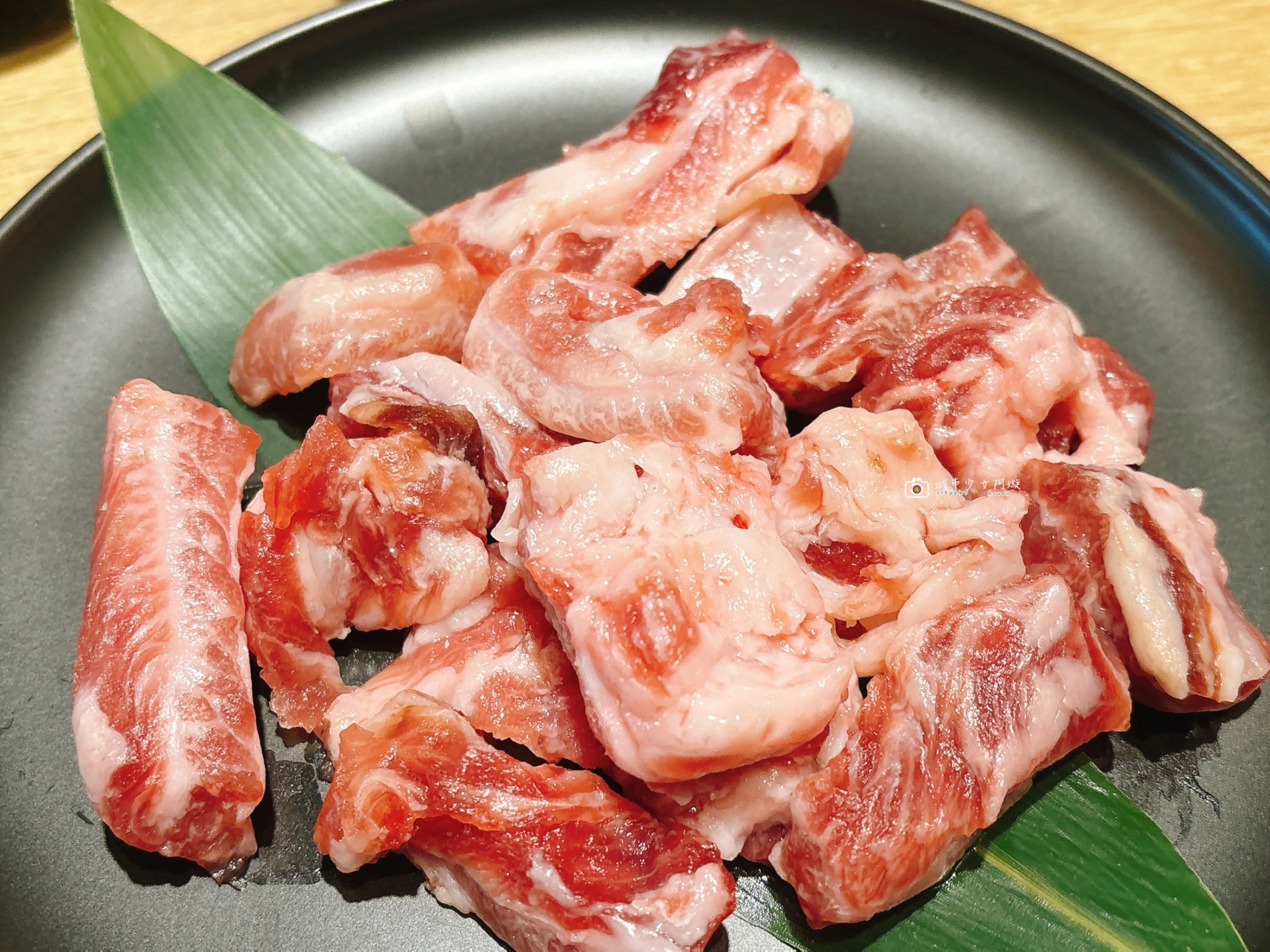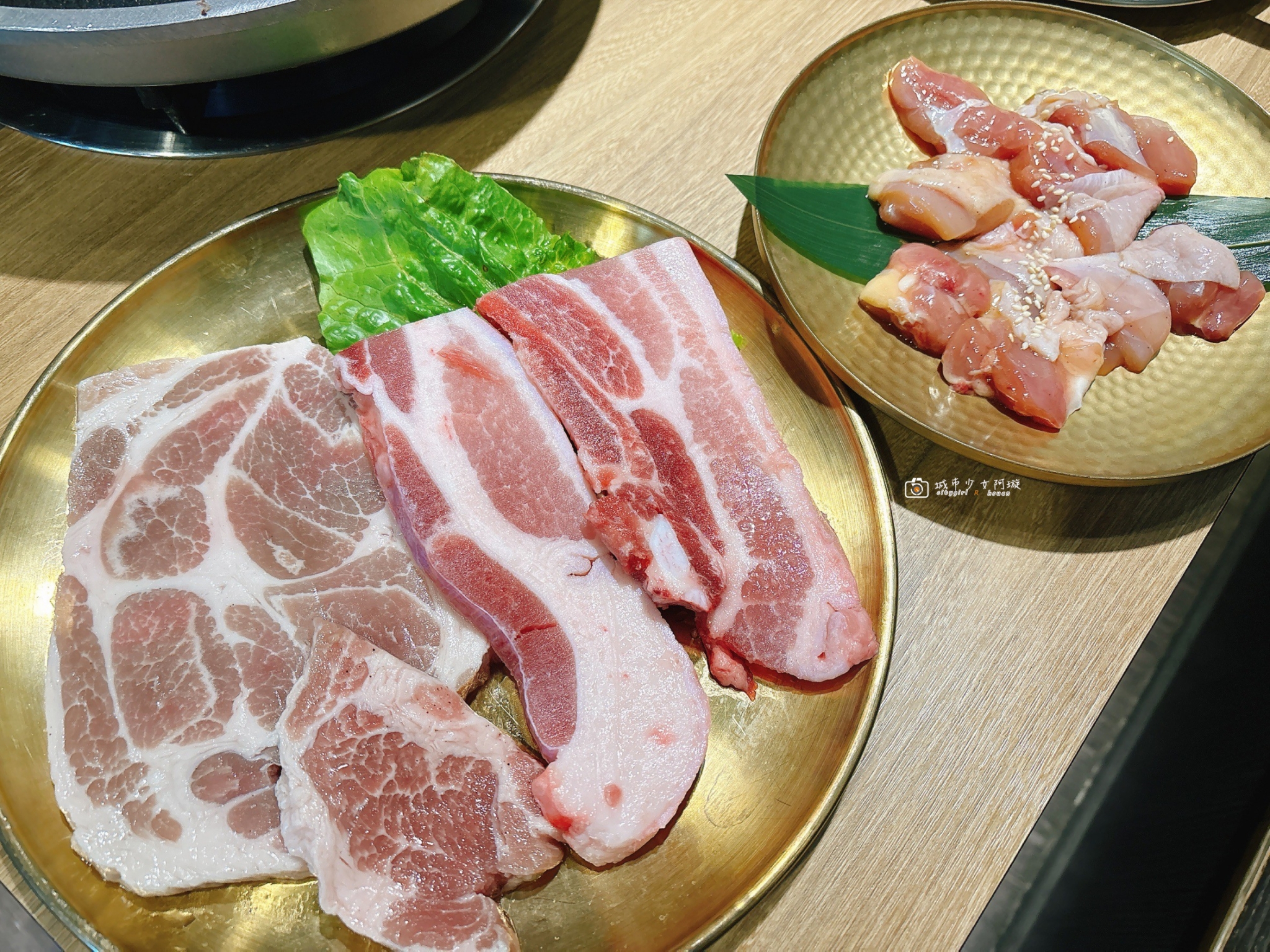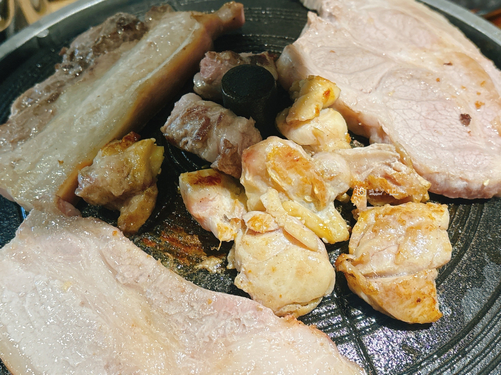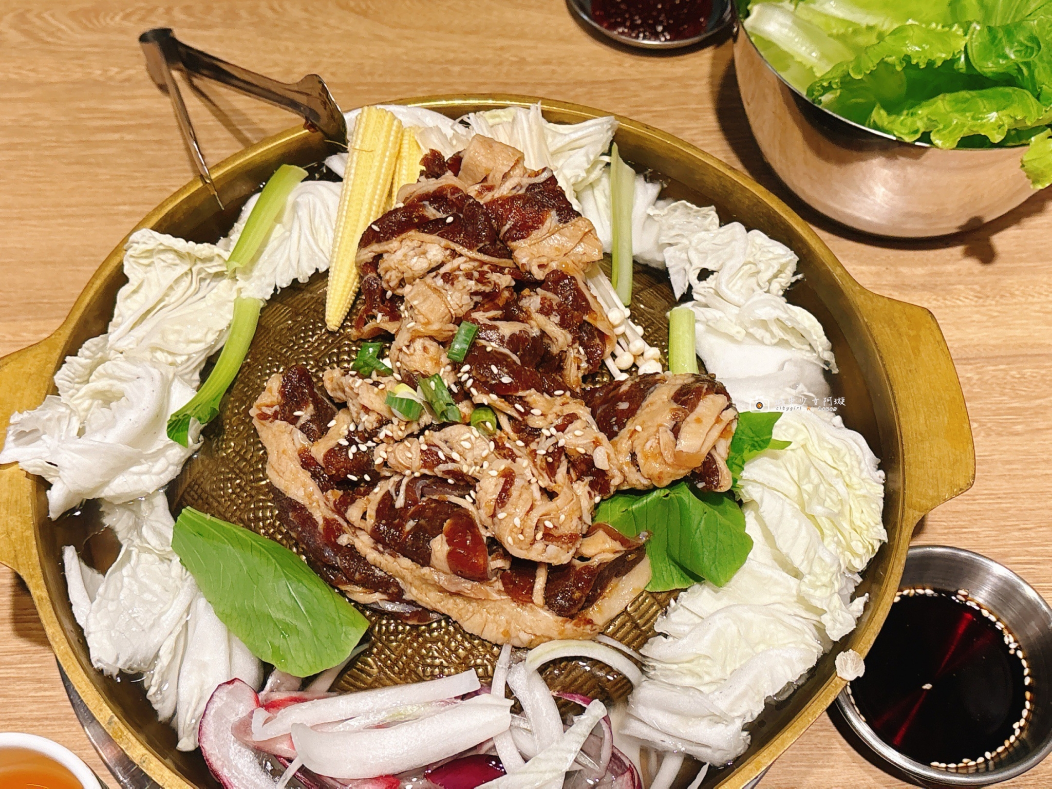 銅盤烤肉,我們點的是豬肉拼盤,必須說完全不輸給燒肉店的肉品等級,不用沾醬料就很美味。