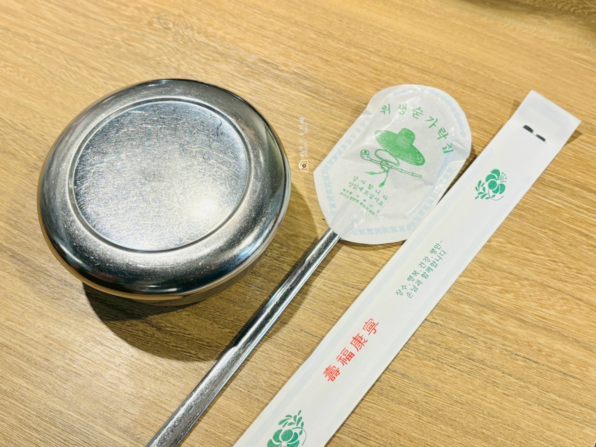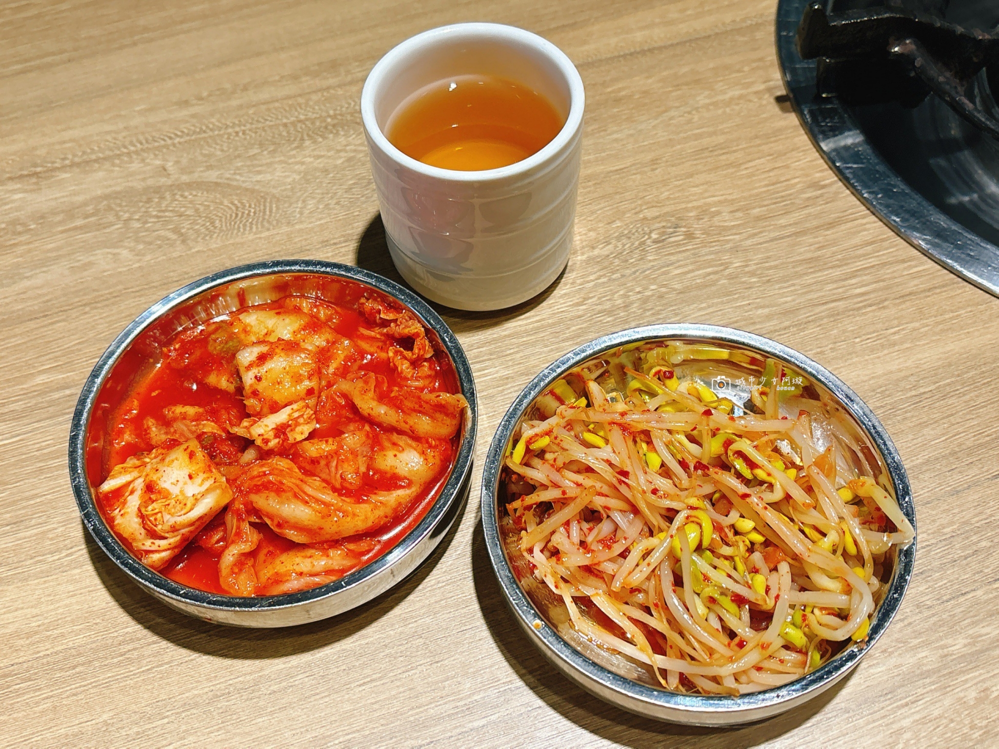 桌上已擺好韓國特有的餐具,有免費熱麥茶可以一直續,跟兩盤小菜招待。但我們每次還是都會點飲料,激推柚子茶,最近終於有無糖茶類了,開心~