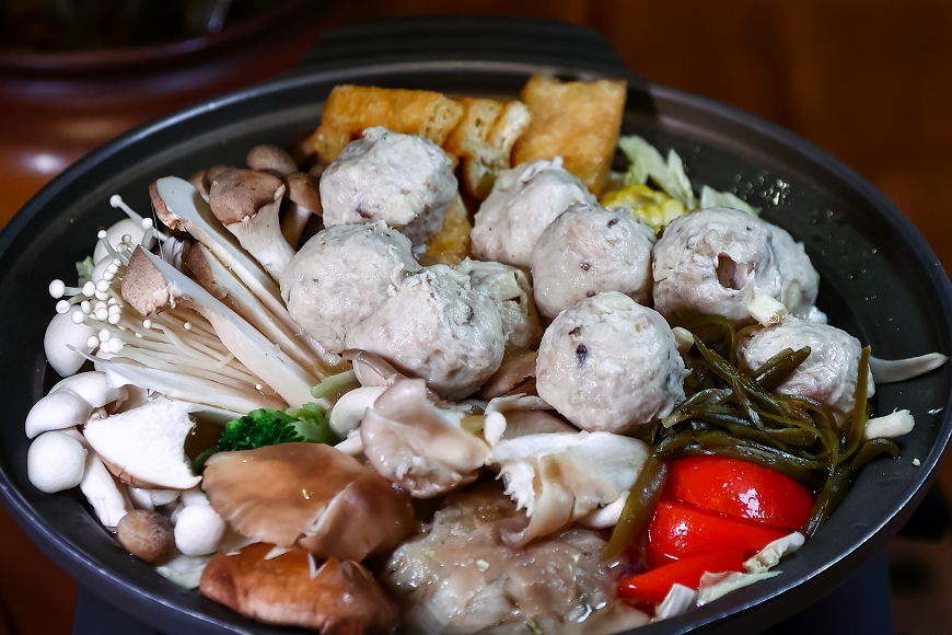 連圓桌必備的火鍋還是極具在地特色,滿滿的筊白筍丸子大顆飽滿,每一顆都能咬到脆口扎實的筊白筍,湯底加入高麗菜、醬筍跟剝皮辣椒熬煮,喝起來酸酸辣辣,回味無窮