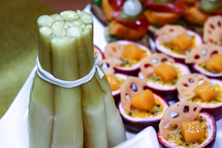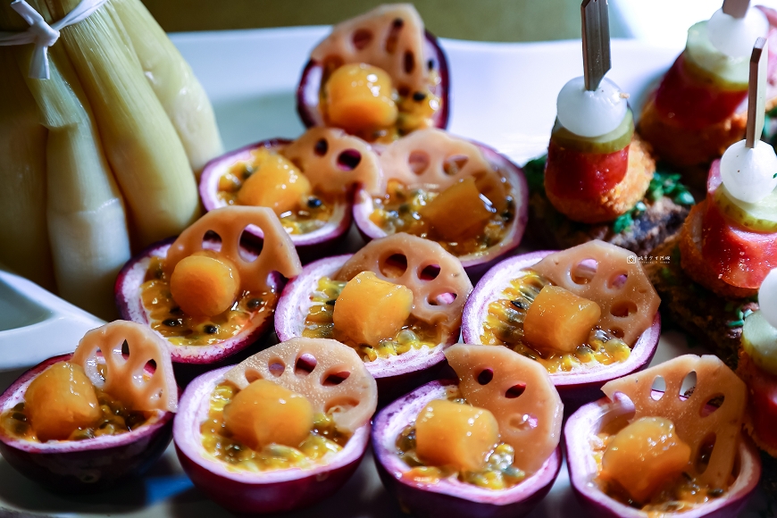 同樣也是埔里特產的百香果入菜,百香果裡頭放上蓮藕片跟干貝,再淋上在地梅醬,清爽開胃~