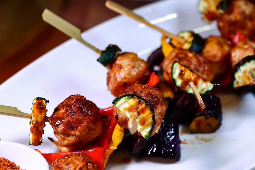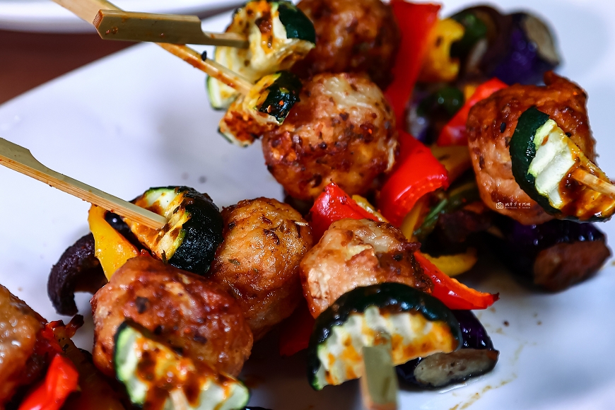 炸過再烤的筊白筍丸,串上櫛瓜、甜椒,真的很有創意