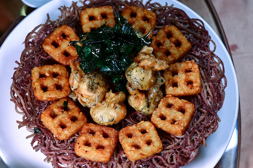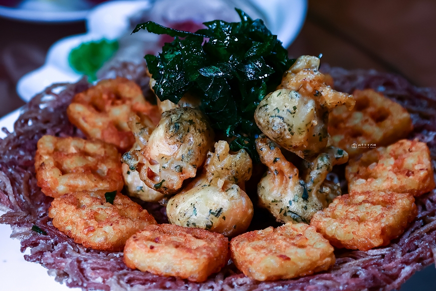 刺蔥炸福袋,不要小看一顆小小的炸福袋,裡頭可是有著埔里香菇、蝦仁跟芋條,吃起來喀滋喀滋,很有層次~