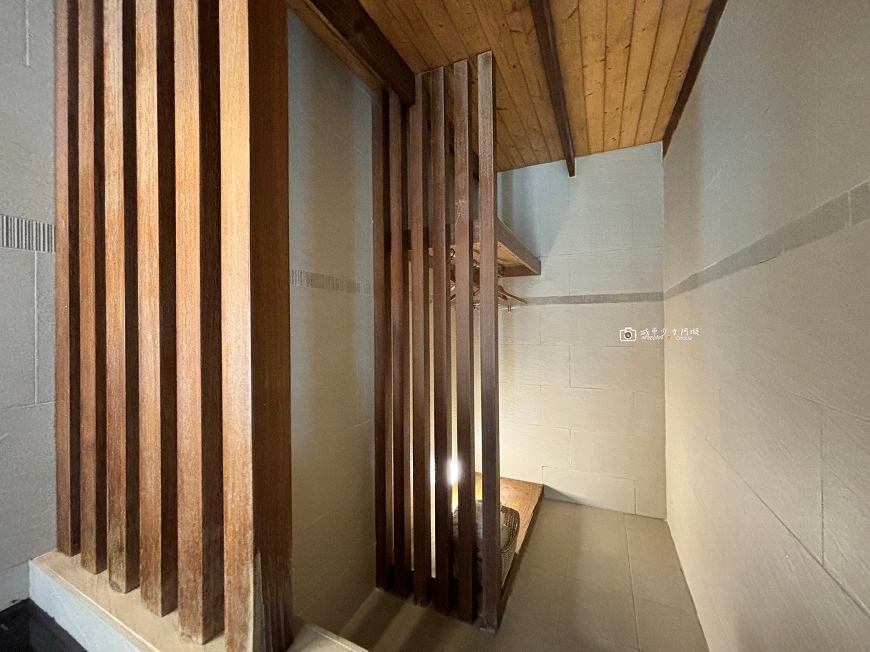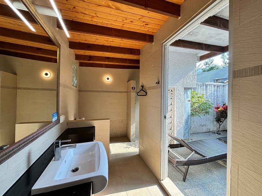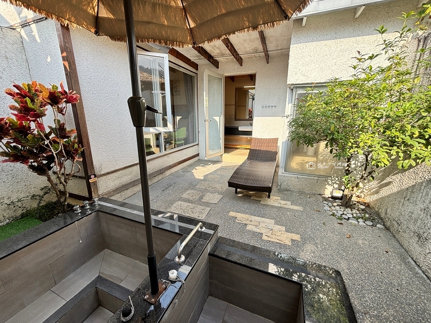 沖澡完就能直接走到露天湯池泡溫泉,庭院的戶外溫泉池分冷、熱兩池,一旁還有躺椅可以休息,超chill~