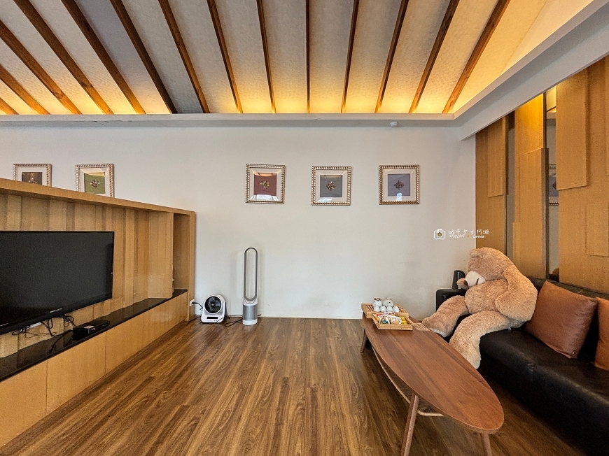 室內空間也是非常大,透過電視櫃隔出溫馨的小客廳,沙發上有大熊熊作伴,小孩肯定馬上衝過去抱緊處理