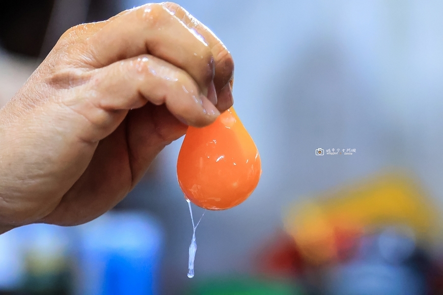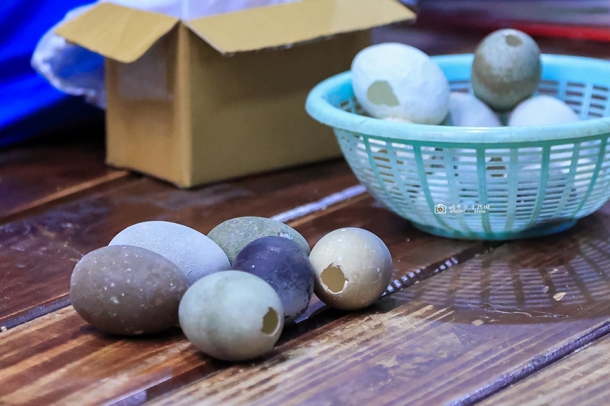 潘氏農場的鴨子採用四重溪的水野放飼養,鴨蛋的品質很好,老闆自豪得展現他家的紅仁鴨蛋品質,好的蛋是非常飽滿且不易破損的,連牙籤穿過都不會影響耶,迷人的橘紅色蛋黃看起來就很營養可口,難怪能聞名全台。