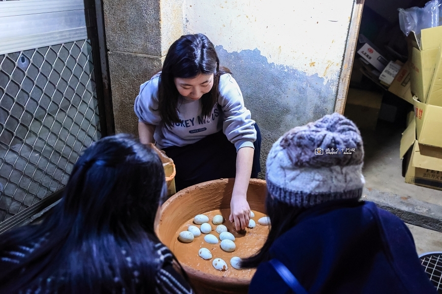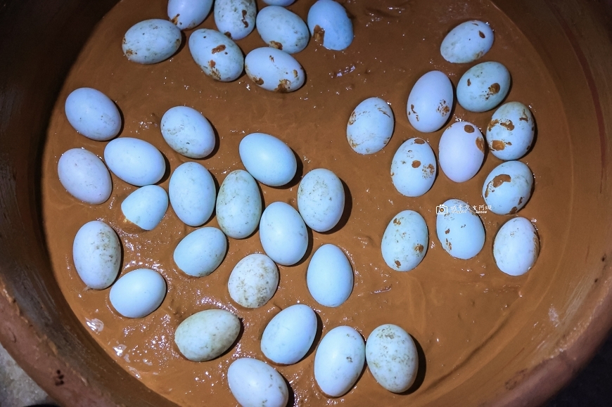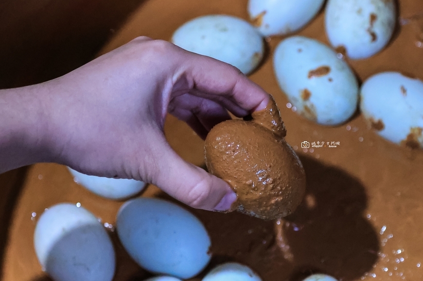 再來就是阿璇期待已久的鹹鴨蛋體驗啦!第一次知道原來傳統的鹹鴨蛋做法是這樣,將鴨蛋放進紅土裡(紅土已事先加了鹽進去),裹滿紅土後再靜置數天,依據個人喜好,可以選擇幾天後煮來吃,過程非常簡單,小孩也可以輕易上手!