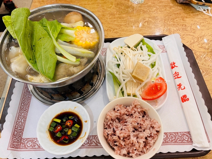 樂爸點了梅子雞火鍋,猛一看好像料不多,但邊吃才其實都已經加在火鍋裡啦,值得一提的是沒有火鍋料,配料都是蔬菜,雞肉分量很多,而且糙米飯再加些許烏龍麵,其實蠻有飽足感