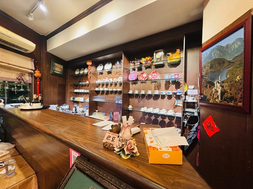店內打著溫暖的黃光,木頭櫥櫃上擺設著各式各樣的餐盤和杯子,看起來都是老闆收集而來的~