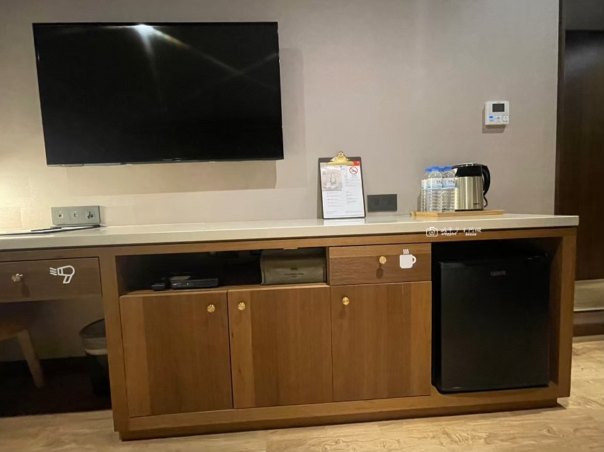 非常長的電視桌與辦公桌、置物區、吧檯一體,整體來說非常夠用,對於喜歡一進房就把身上東西都拿出來放著的阿璇非常喜歡這種設計。
