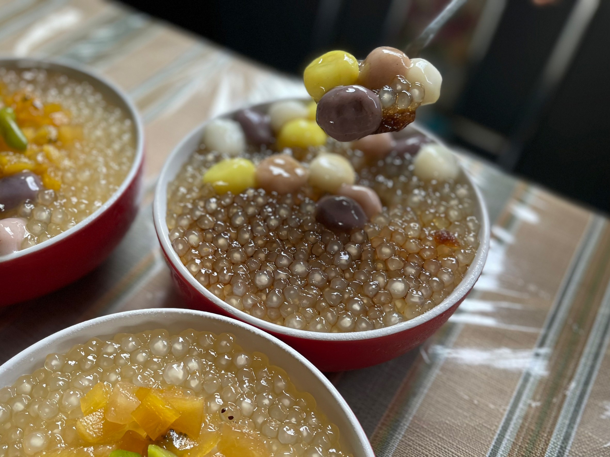 顏色繽紛的可愛湯圓吃起來超級滿足,很Q彈,黑糖炒得香氣很夠,甜度剛剛好不會太膩