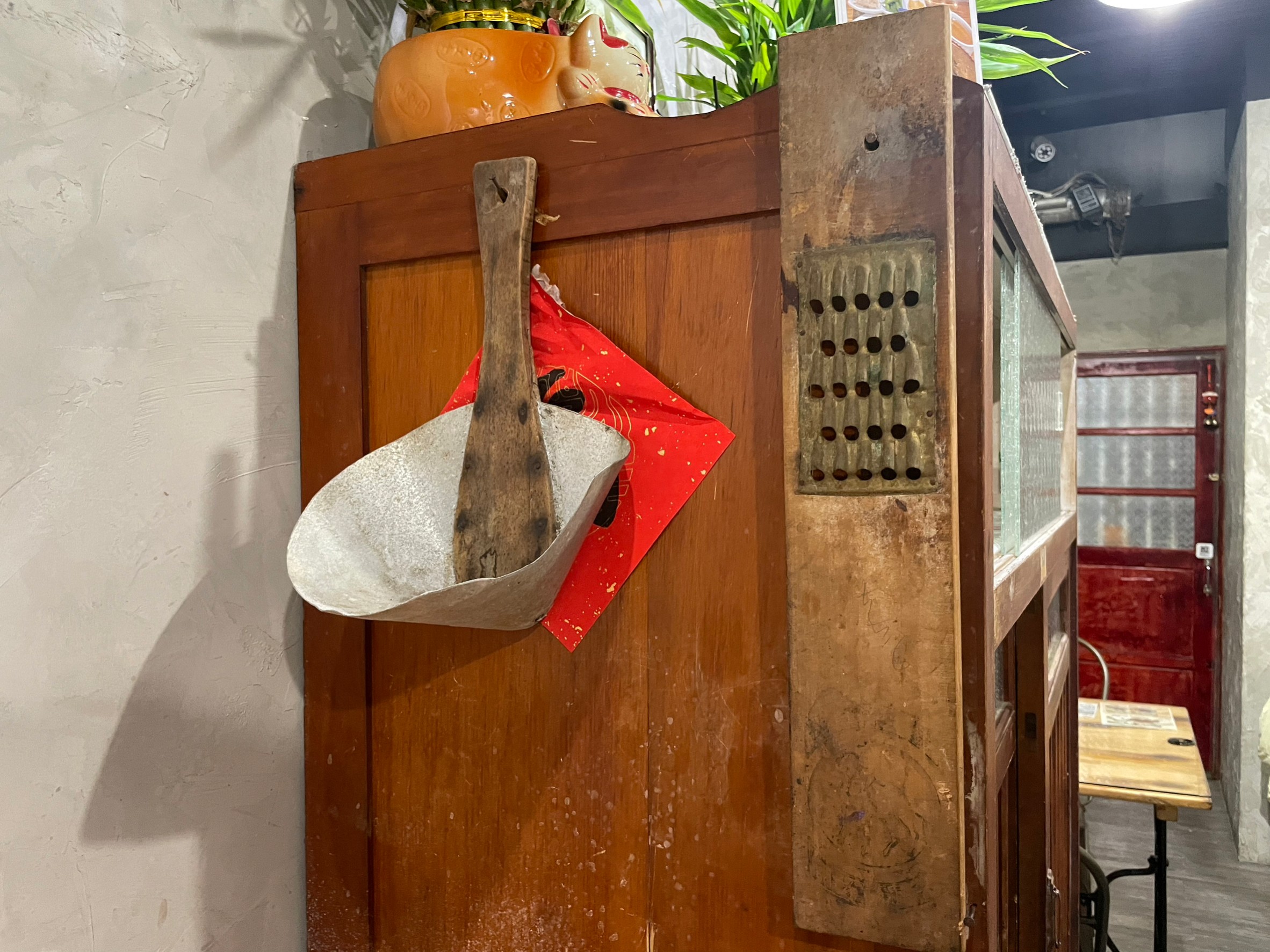 一旁的櫥櫃看起來是古董,很像小時候阿公阿嬤家才會出現的擺設