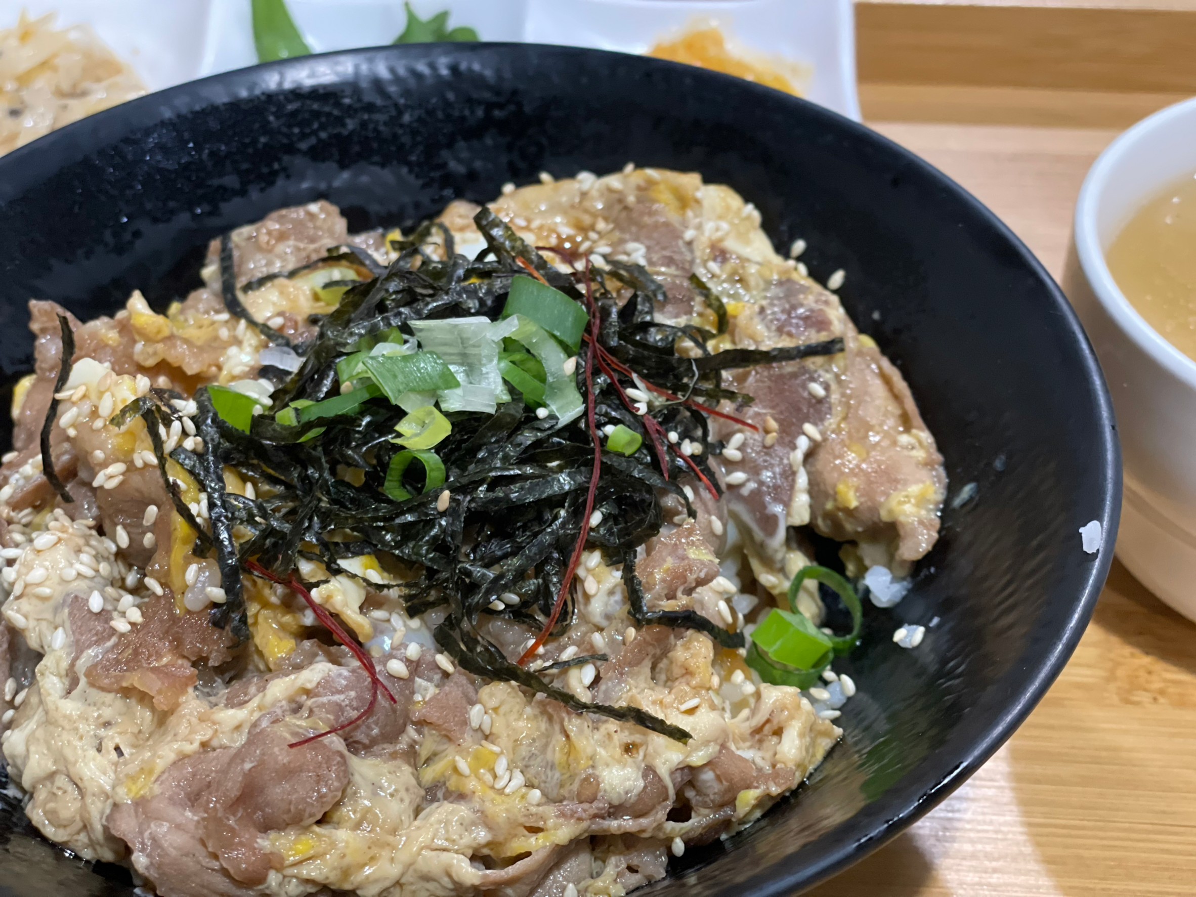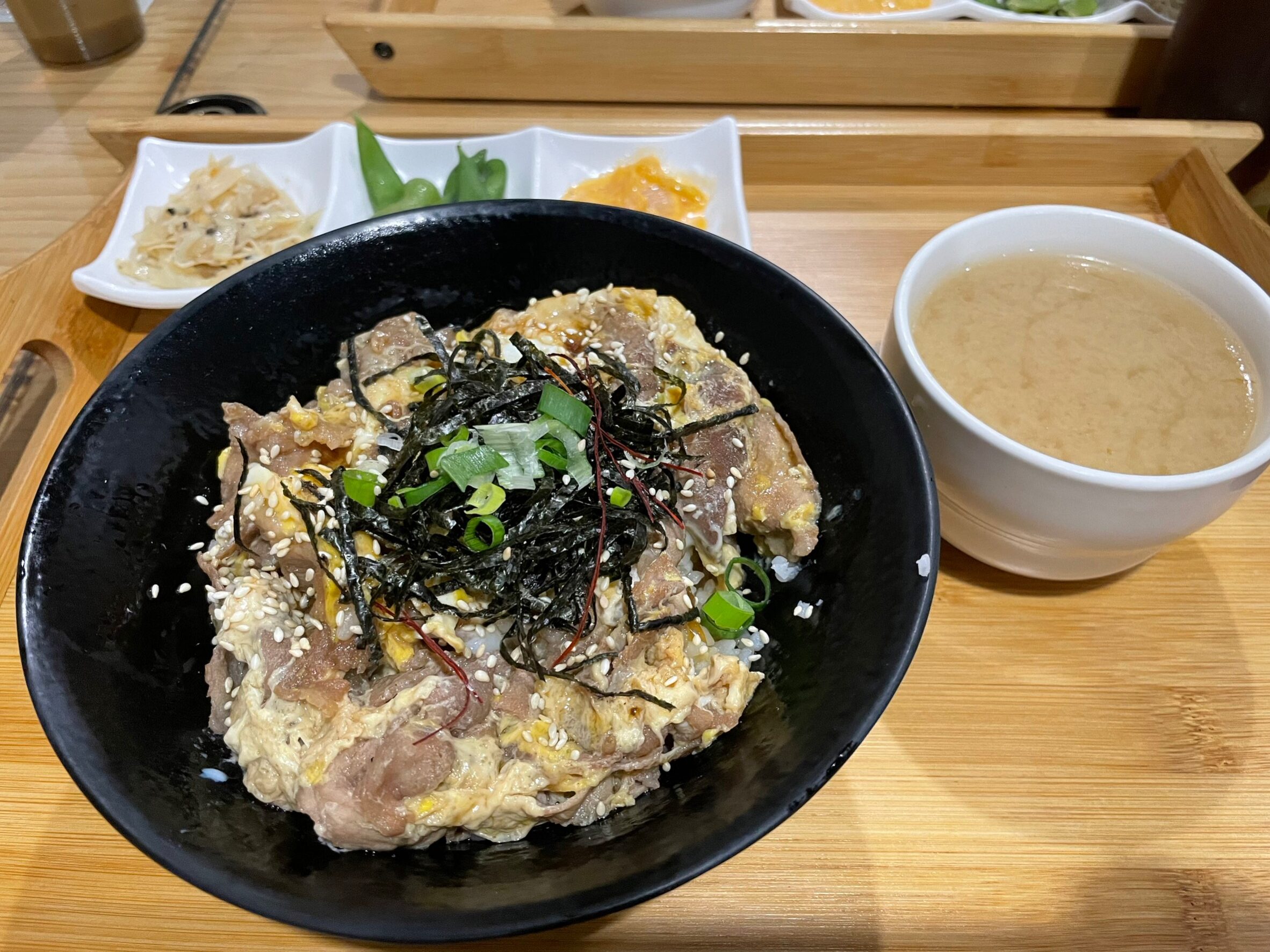 樂爸點的是豬肉丼飯,海苔絲超多,阿璇直接挖走拿去給樂樂配飯XD 滿滿的肉片裹上半熟蛋,樂爸說味道還不賴