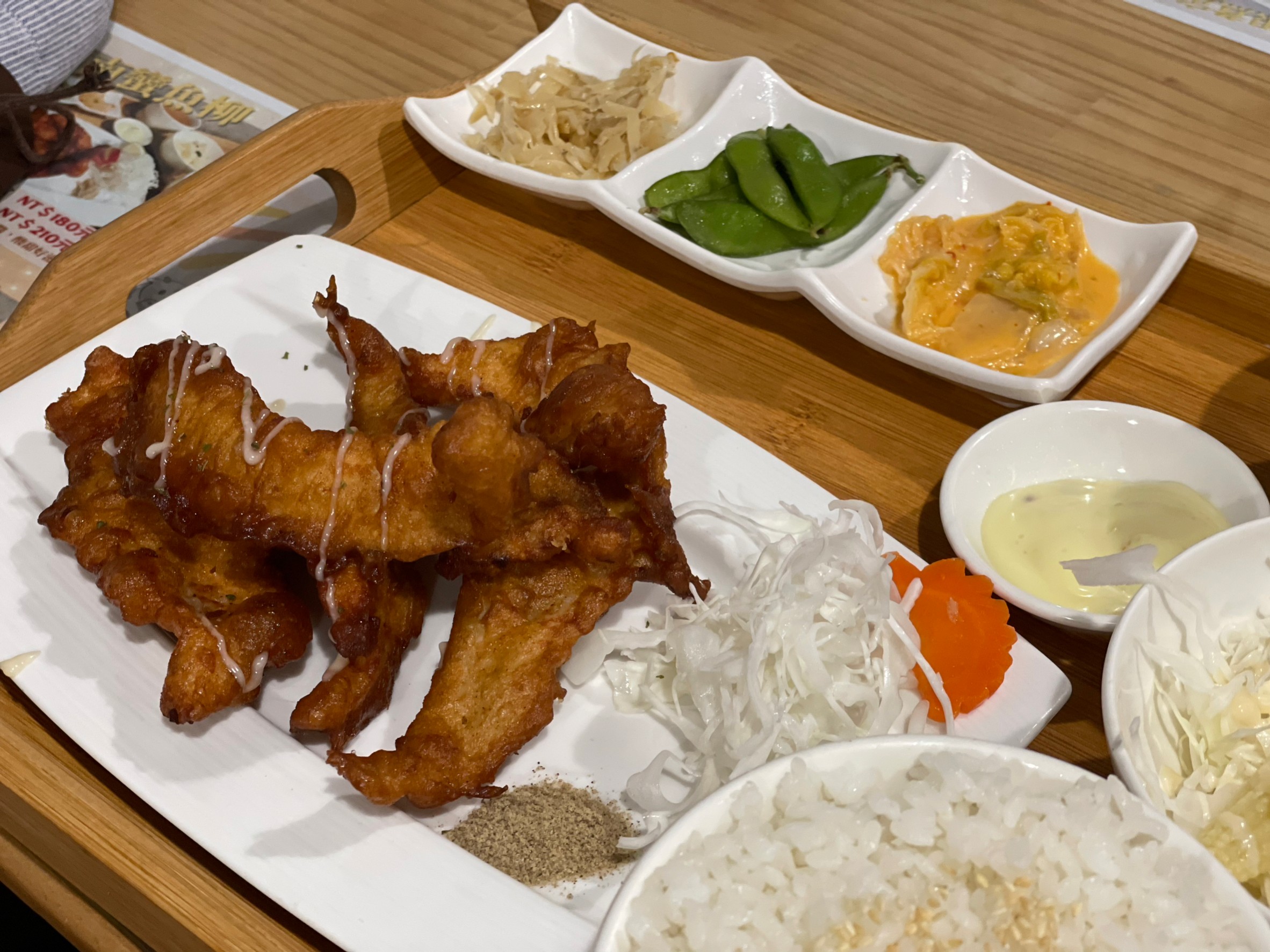 婆婆點了香酥竹筴魚定食,有三樣小菜、沙拉和味噌湯,整體份量不少,而且每一塊炸魚都超大塊,阿璇有偷吃一塊,美拍呷~黃金泡菜會辣,但是超推,非常夠味又開胃,好吃!!!