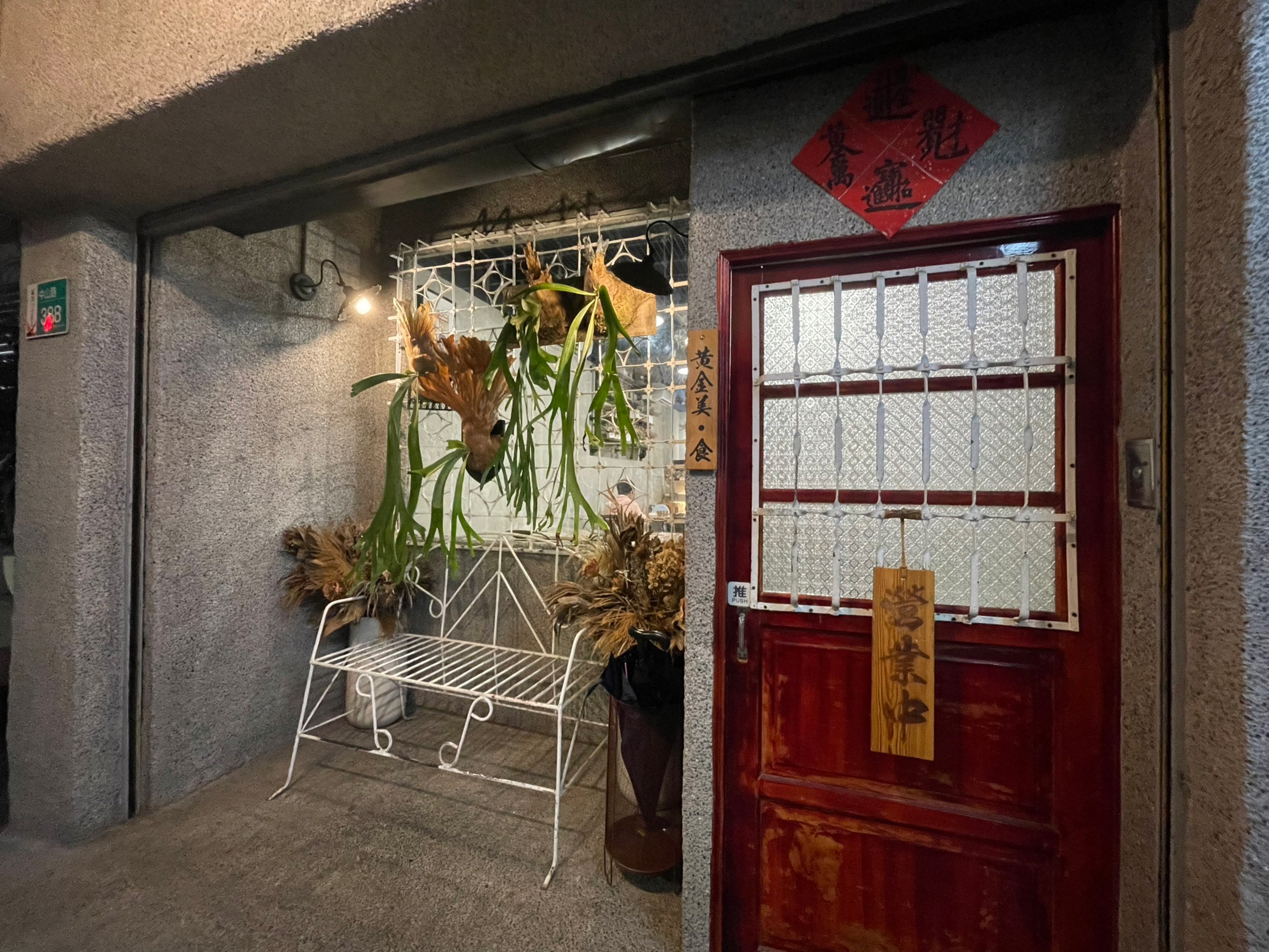 鹿角蕨、乾燥花、木門,看似違和的元素湊在一起,倒還挺有美感的