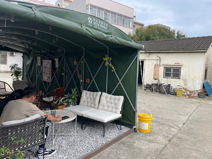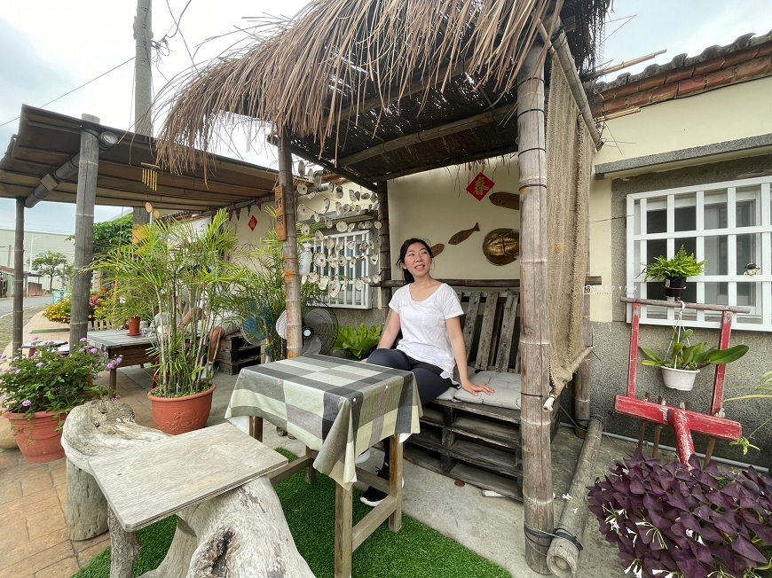 走進一旁的小徑會發現有自家車庫棚子裡的座位區,超特別的