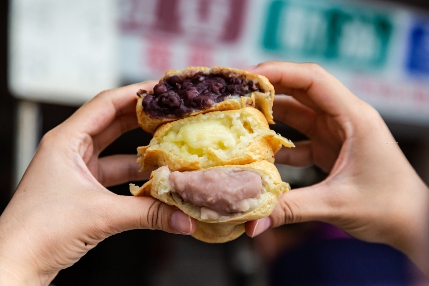 每一口咬下都能超滿足,紅豆餡甜度剛剛好,很有顆粒感;奶油口味是古早味那種,吃起來超有童年回憶;芋頭口味也是能吃到真材實料,這攤市場銅板美食,阿璇大推~