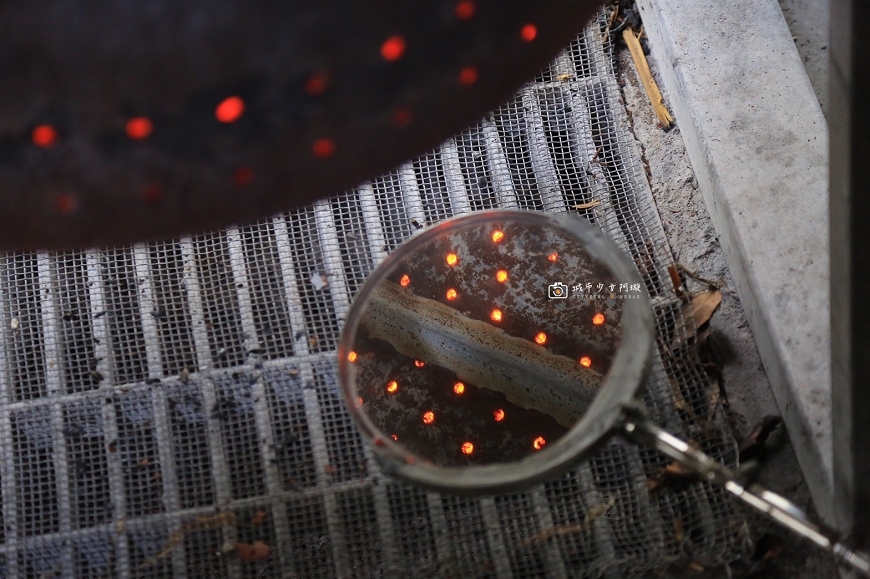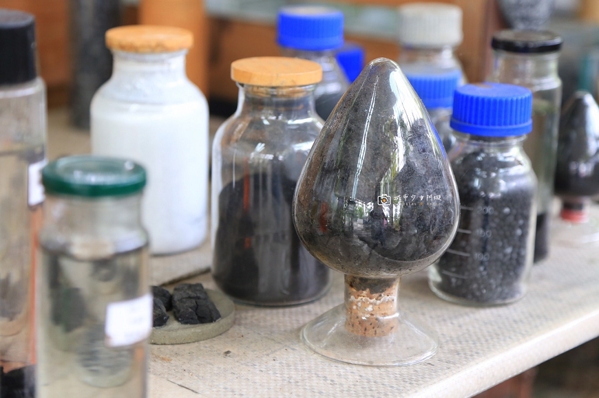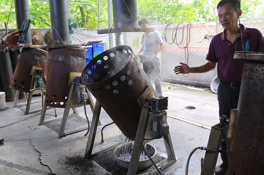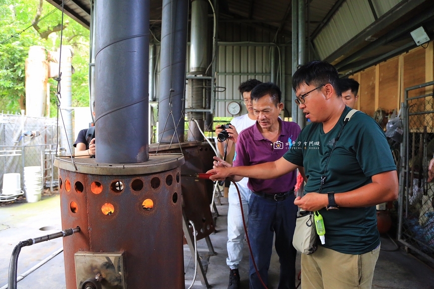經過特殊設計的炭化設備焚燒,老師介紹菱殼炭萃取過程