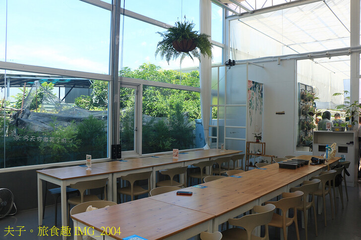 室內區為玻璃屋,自然光充足,屋頂設有遮陽布空調充足,一條通道將室內空間一分為二,左邊二排直排餐桌為用餐區 (照片),右邊為點餐櫃檯與料理製作區。
