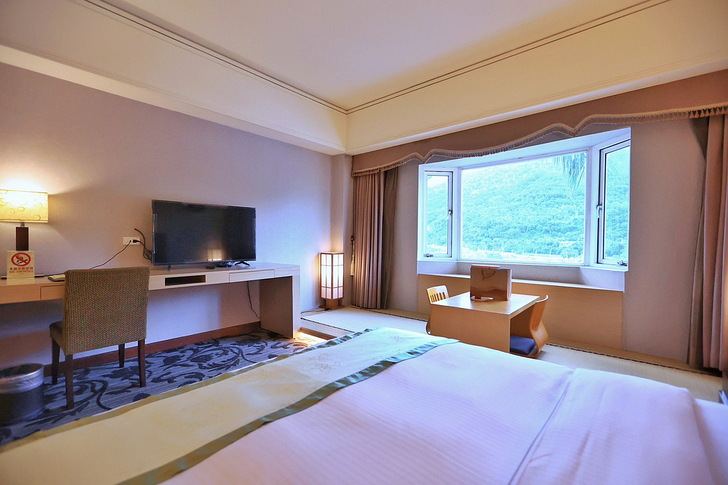 豪華景觀雙人房,大型三面窗鏡面玻璃,窗景引入山景,陽光灑落滿室綠意。