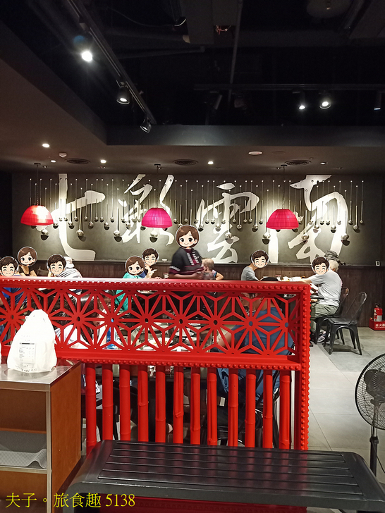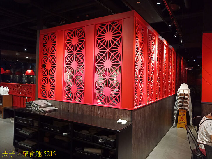 方長桌區佔整個用餐空間的 1/4,以紅色格柵隔出。