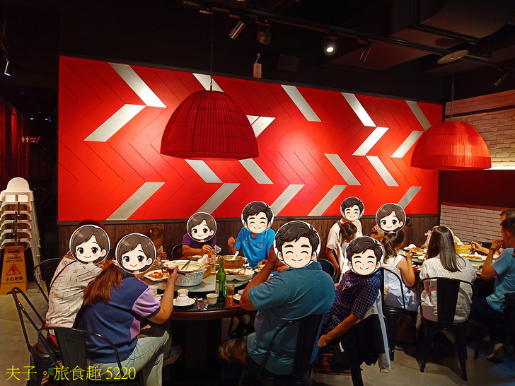 用餐空間以紅色格柵區隔,方便不同用餐人數的座位需求,概分二區:方長桌區與圓桌區。方長桌區以6人長桌與4人方桌配置,可拆開或合併,適合少人數用餐,圓桌區的圓桌適合八人以上的親朋好友闔家聚餐使用。