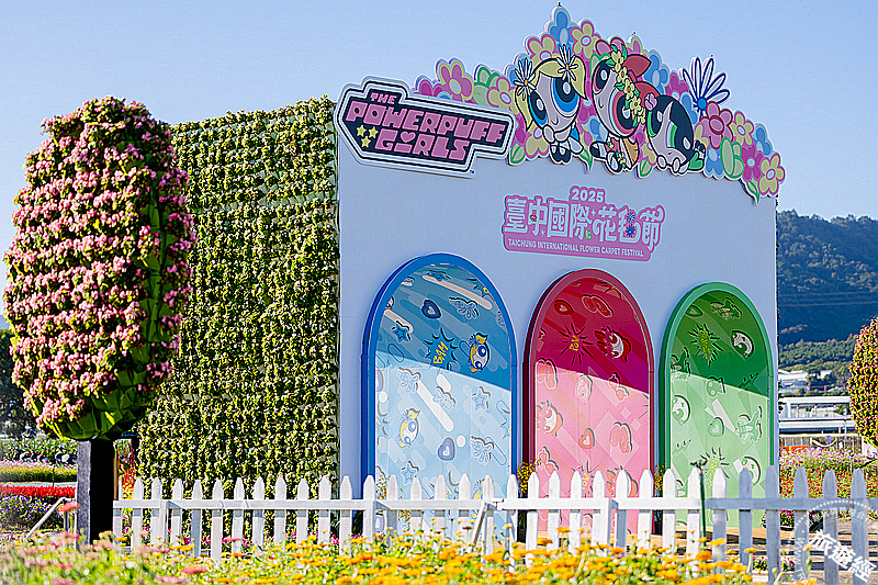 「2025新社花海暨台中國際花毯節」,現場除了花海,還設置了15個裝置藝術,可以看到多個呈現飛天小女警角色的藝術裝置,包含:聰明樂觀的領導者花花(Blossom)、天真愛撒嬌的少女代表泡泡(Bubbles),以及活潑好動的堅強後盾毛毛(Buttercup)!還有許多隱藏角色元素等大家來探尋!