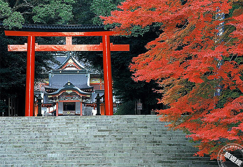 鹿兒島「霧島」國道223號線沿途有被指定為國寶的霧島神宮,旅人可在神社參道欣賞社殿與鮮紅秋葉相互輝映。(圖片由鹿兒島縣觀光聯盟提供)