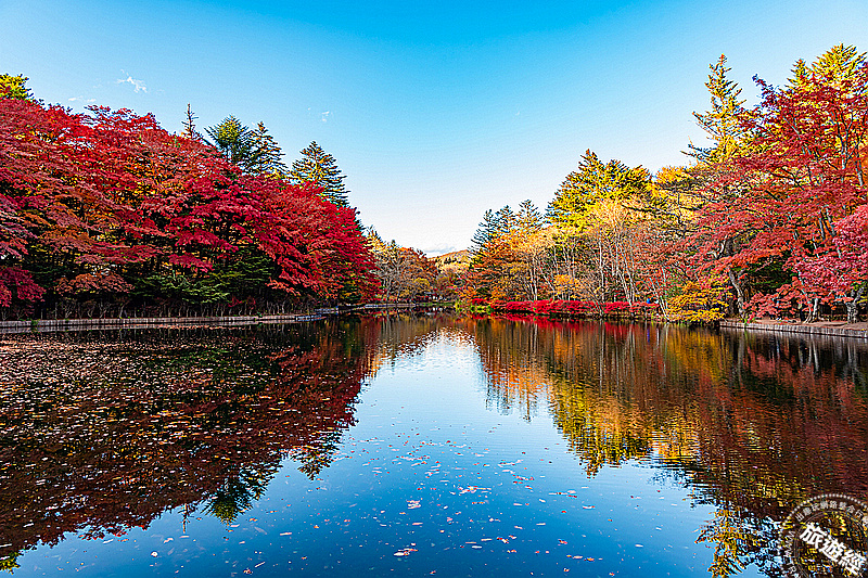 雲場池距離「輕井澤站」步行僅約15分鐘即可抵達,是當地最受歡迎的觀光景點之一,池塘兩側長滿色彩繽紛的樹木,倒映在水面上,形成如畫美景,特別是南口附近的觀賞點,能將藍天和秋葉的倒影盡收眼底。池畔設有步道,環繞一圈約需20分鐘,旅人可漫步欣賞對岸和水中的秋葉,感受被絢麗色彩包圍的奇幻世界,一覽楓樹和杜鵑花呈現紅、黃、橙的漸層美景。