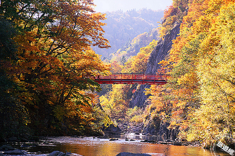 北海道「定山溪」素有「札幌後花園」之稱,距札幌市中心僅約一小時車程,沿豐平川溪谷可賞紅葉。旅人可從溫泉街、步道或露天溫泉等不同角度賞景。最不容錯過,當然是「二見吊橋」,這吊橋可是溫泉街的代表景點,每年秋冬被紅黃秋葉環繞,景色迷人。此外,旅人更可搭乘「秋葉纜車」登上「360度山頂全景展望台」,飽覽整片秋葉,天氣晴朗時甚至能遠眺石狩灣與小樽港。