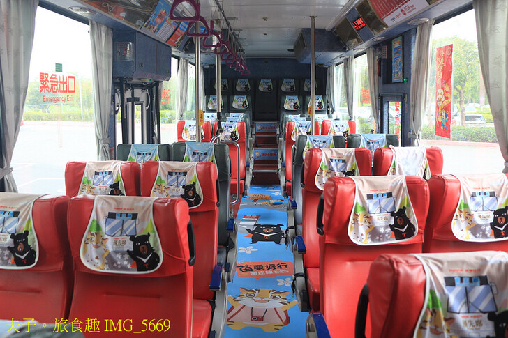 上車囉!台灣好行南庄線 (5805A) 公車,走道地貼與座椅枕巾,有著滿滿的客家桐花意象,搭配苗栗吉祥物貓裏喵與觀光局喔熊組長圖案,活潑繽紛讓人心情大好。