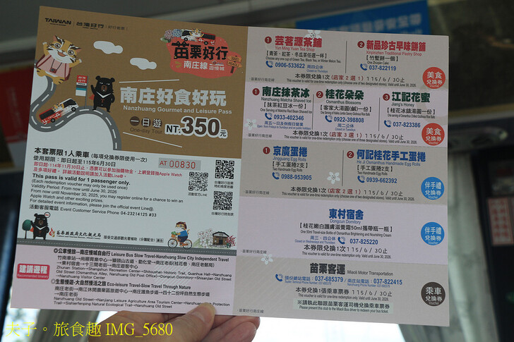 台灣好行 (苗栗好行) 南庄線「南庄好食好玩」一日遊套票,價格:$350元。