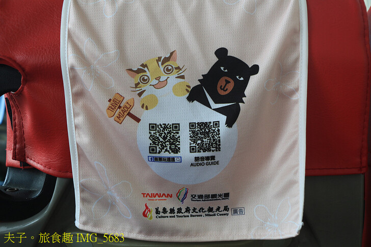 椅背枕巾上,有苗栗好行南庄線景點語音導覽與苗栗玩透透 FB 粉專 QRcode,手機掃瞄即可上網讀取。