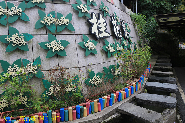 「桂花巷」大同路口,擋土牆上一整面美麗的桂花裝飾,底下是「水汴頭洗衫坑」,昔南庄居民利用灌溉水圳,架著多塊石板搭建而成的洗滌場地 (目前也是),這裡的水質清澈,仔細一看水底還有魚兒悠游。