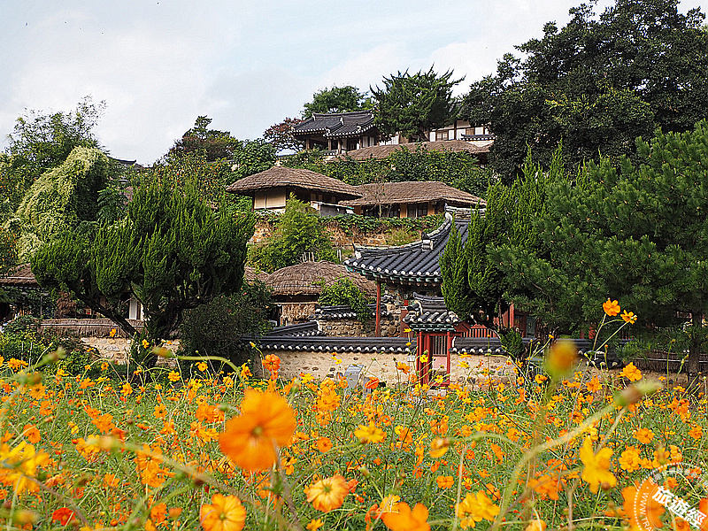 良洞村完整地保留了朝鮮王朝時期的傳統建築風格和生活習俗,不但被指定為韓國「國家民俗文化財」第189號。2010年,與安東河回村一同以「韓國歷史村落」的名義,被聯合國教科文組織列為世界文化遺產,而「良洞村」不僅有一般百姓居住的茅屋傳統聚落,這裡還是朝鮮王朝時期兩班(貴族階層)「月城孫氏」與「驪江李氏」所建立的傳統韓式聚落,不僅非常有歷史和文化意義,還是被列為世界文化遺產,更是具烟火氣的文化遺產。村落依山傍水,錯落有致的韓屋在山坡上鋪展開來,是韓國最大的集姓村之一,值得一提的是──地處高處的「觀稼亭」是朝鮮成宗時期官員孫仲暾的居所,這座韓屋被視為一個研究朝鮮王朝中期建築的好例子,為寶物442號,若是不知成宗是誰?在最近爆紅的韓劇《暴君的廚師》中,主要主角就是成宗的兒子「燕山君」,是否覺得歷史一下子靠您其實並不遠,而值得一提的是──秋季的良洞村,除了有村落、歷史之美,也因為種植了若大的黃色波斯菊,以及家家戶戶種植的杮子樹都結實纍纍,橘黃的柿子呈現了秋收的福音,在顯現質樸的風光外,也增加了秋意及詩意!