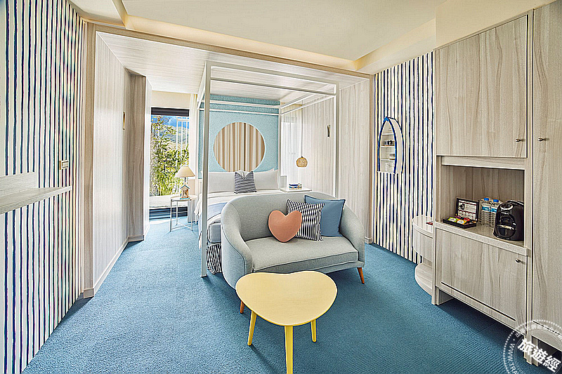 「1212年終盛典」雙人成行加價1,212元即可入住景緻客房,藍白色的活潑配色搭配戶外大露臺,邀旅人以最放鬆的姿態坐看日月星辰。圖/墾丁凱撒提供