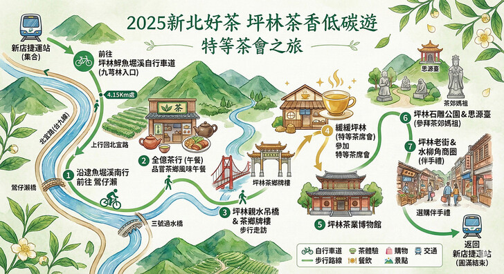 2025新北好茶「坪林茶香低碳遊特等茶會之旅」行程:新店捷運站集合→前往坪林區九芎林坪林𩻸魚堀溪自行車道→鶯子瀨橋→三號過水橋處→全億茶行午餐→「緩緩坪林」特等茶席會→坪林茶業博物館→坪林石雕公園→思源臺參拜茶郊媽祖→坪林老街及水柳角商圈→返回新店捷運站,賦歸。