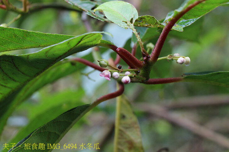 導覽老師生態解說:水冬瓜為低海拔的常綠灌木,夏季開花秋季結果,碗狀粉紅色小花十分討喜,球形果實,成熟時會呈現晶瑩剔透的乳白色,果實汁液黏稠可食用具甜味,原住民戲稱他為「好吃的鼻涕」。