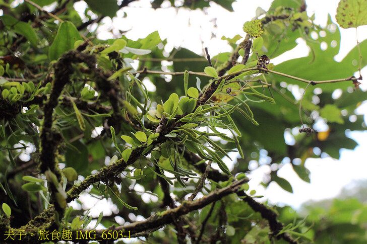 樹幹上的伏石蕨很特別,擁有與其他蕨類不同的「兩型葉」:營養葉與孢子葉。較圓胖的營養葉,專營光合作用製造養分,為求較有利於光合作用進行,其葉面的生長方向會與光線垂直相交。較細長的是孢子葉,其主脈兩側具有長線形的孢子囊群,負責傳播與繁殖,當然也兼營光合作用,值得仔細觀察。