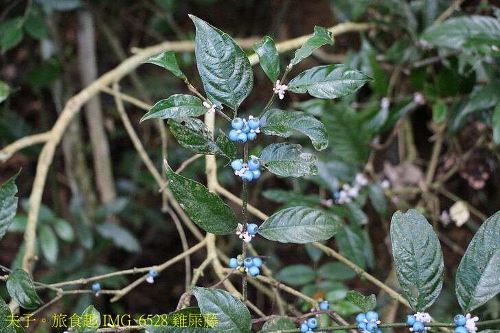 圓葉雞屎樹,雖名圓葉但卻很少圓形,開小白花,成熟果實呈現藍色非常特別,枝葉揉碎後聞之,有一股類似雞屎之異味,故而得名。