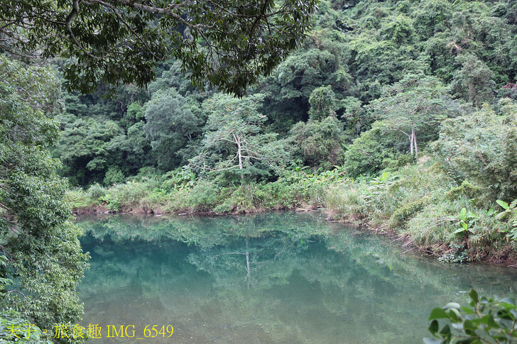 𩻸魚堀溪一處緩流,綠樹映襯藍天白雲,幻畫絢麗多彩的湖光水色,有著「湖光倒影浸山青」的絕美景色。