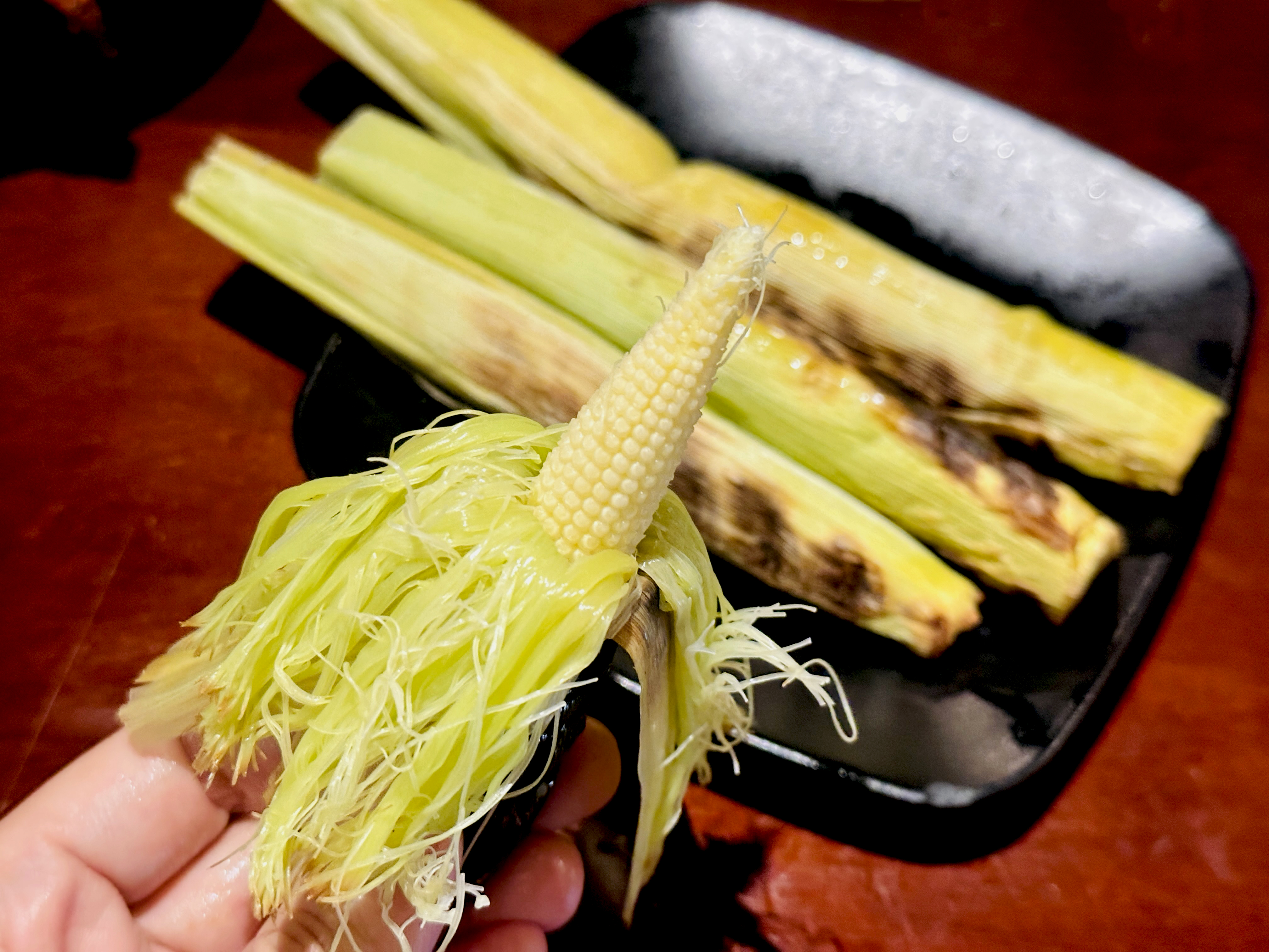 帶皮玉米筍 剝開外皮後是又嫩又甜的玉米筍,旁邊的鬚鬚其實營養很高,也可以一起吃!