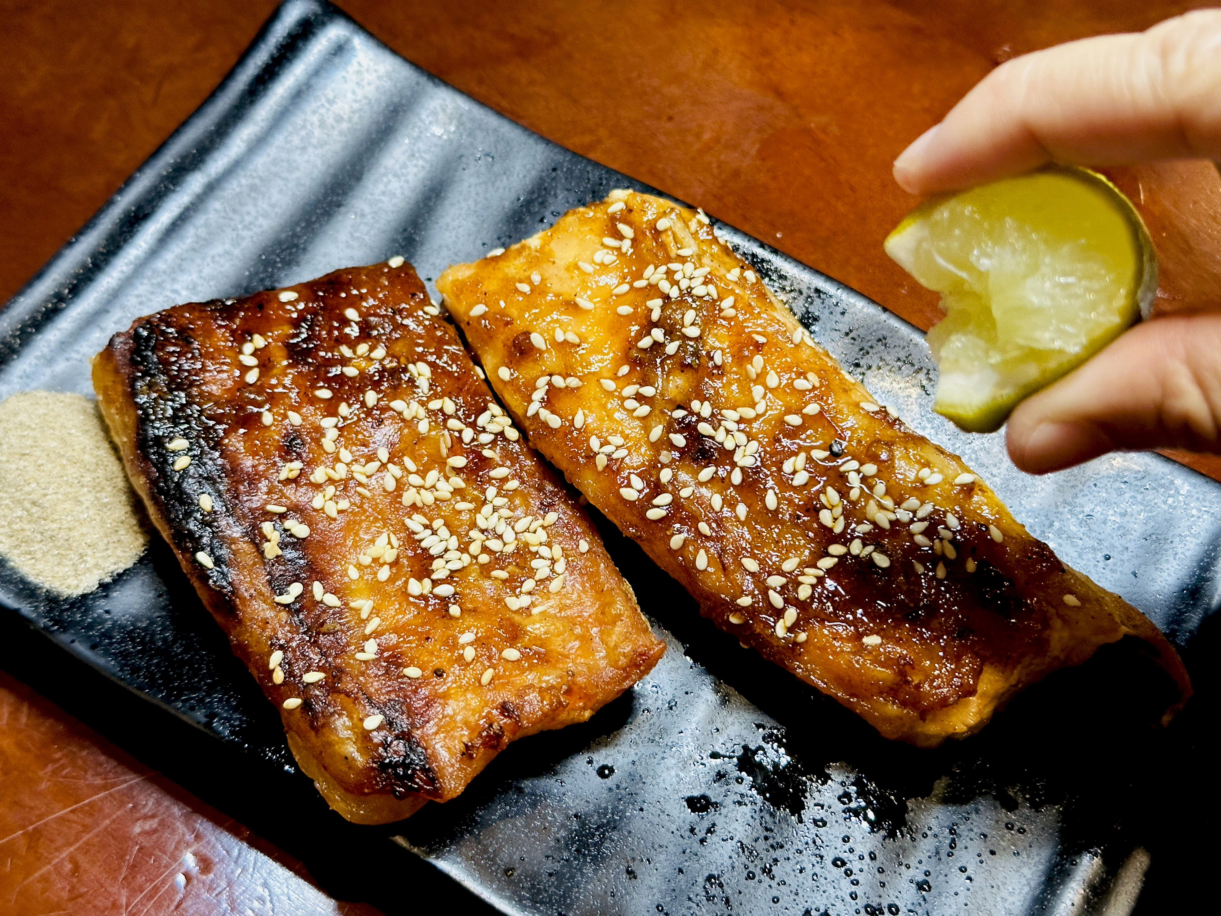 烤鮭魚肚 帶焦脆香氣,魚肉軟嫩、油脂香氣剛剛好,加點檸檬更清爽,是我們非常推薦的烤物之一