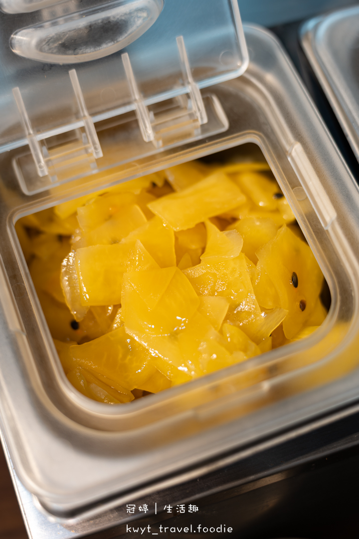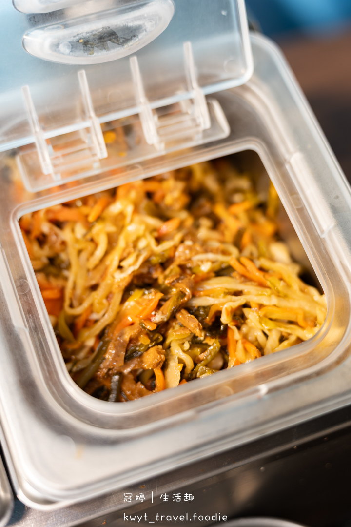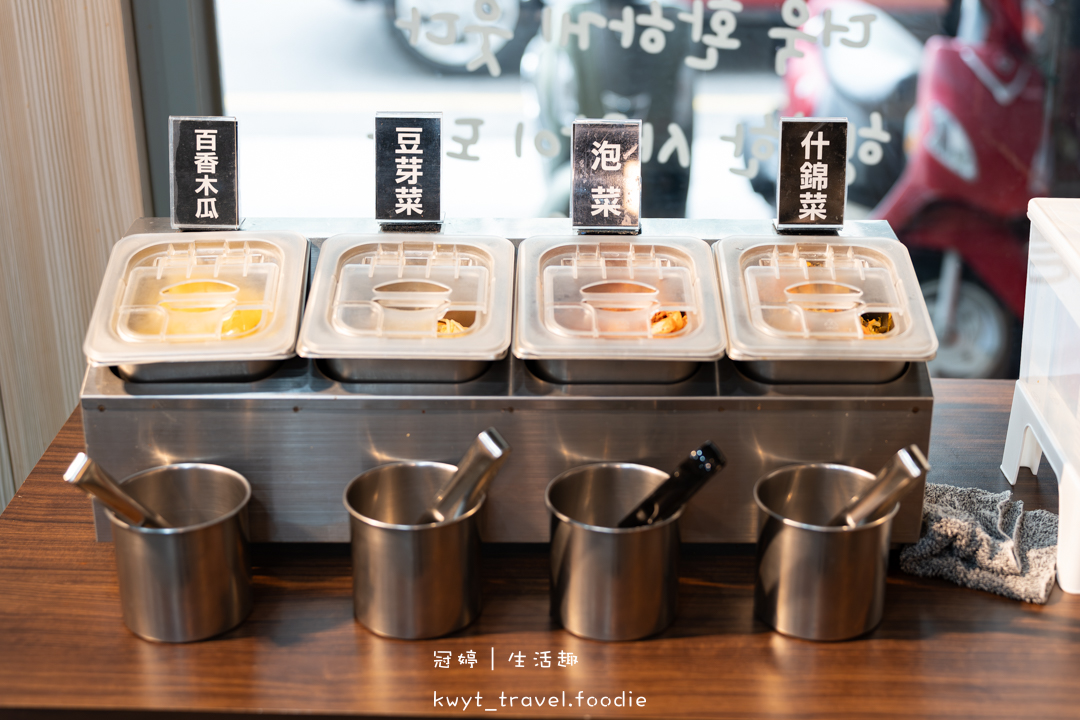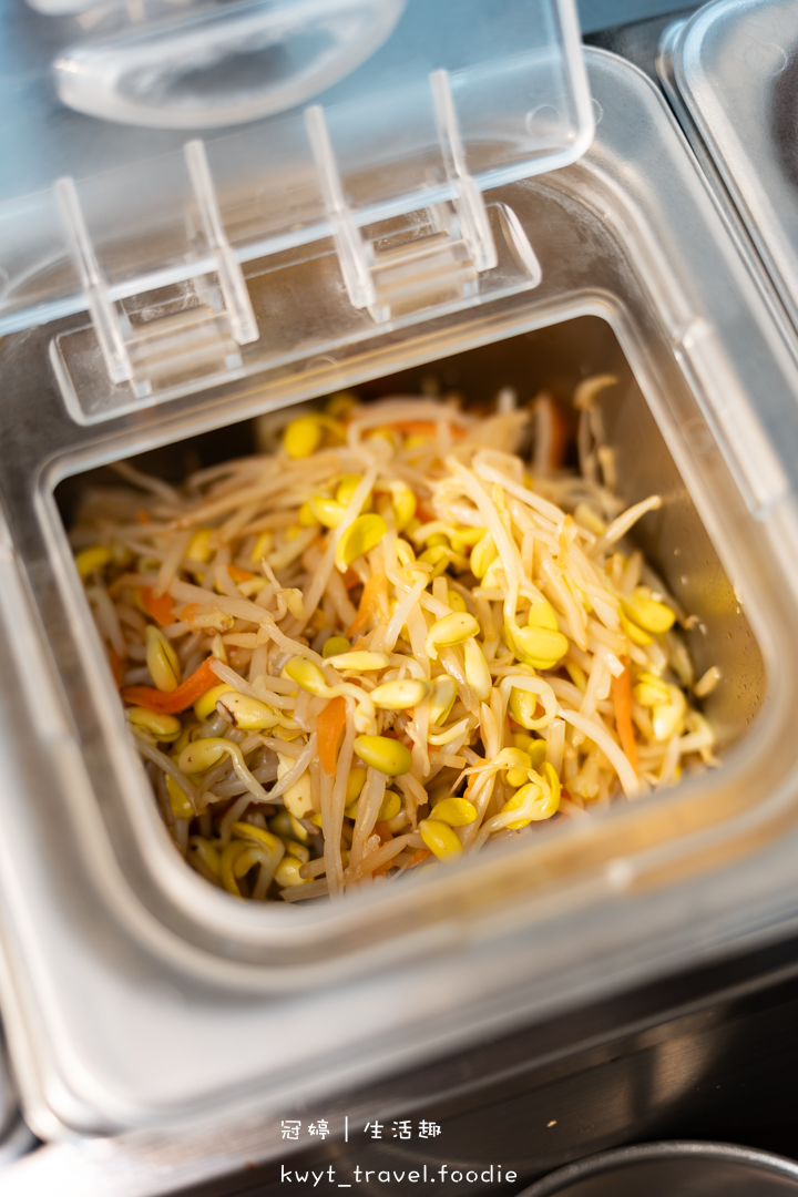 自助吧檯隨時保持乾淨整潔,一字排開的手做韓式小菜],由左至右依序是:百香木瓜、豆芽菜、泡菜、什錦菜,任你夾取。
