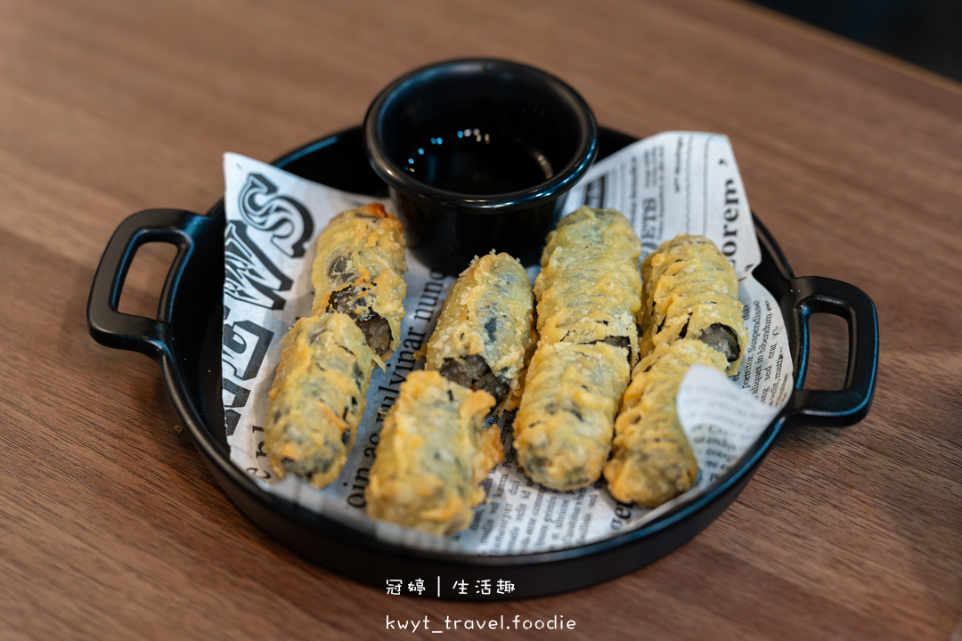 外層海苔裹粉炸得酥脆,內餡是調味過的Q彈韓式冬粉,推薦一點牛肉嫩豆腐鍋的湯,加倍美味。