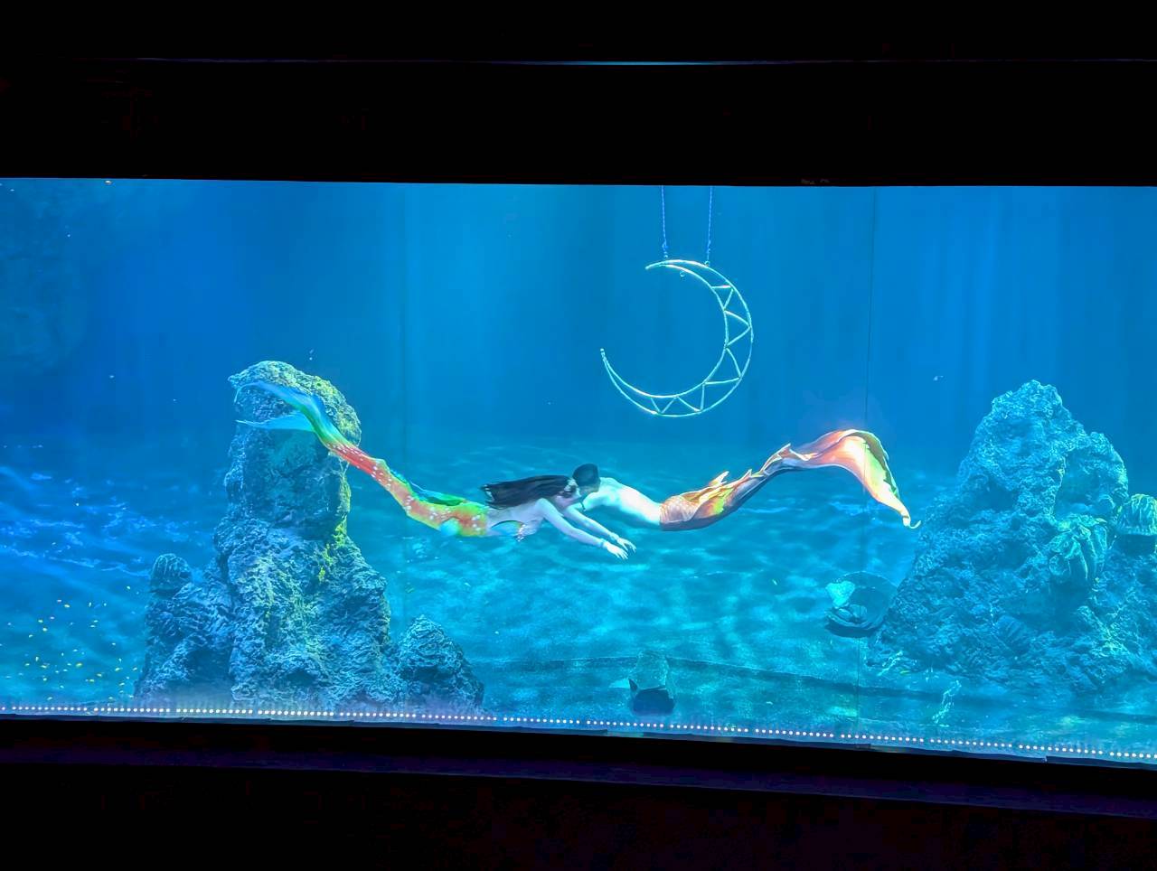 表演者穿著美人魚尾巴,在水中優雅游動,